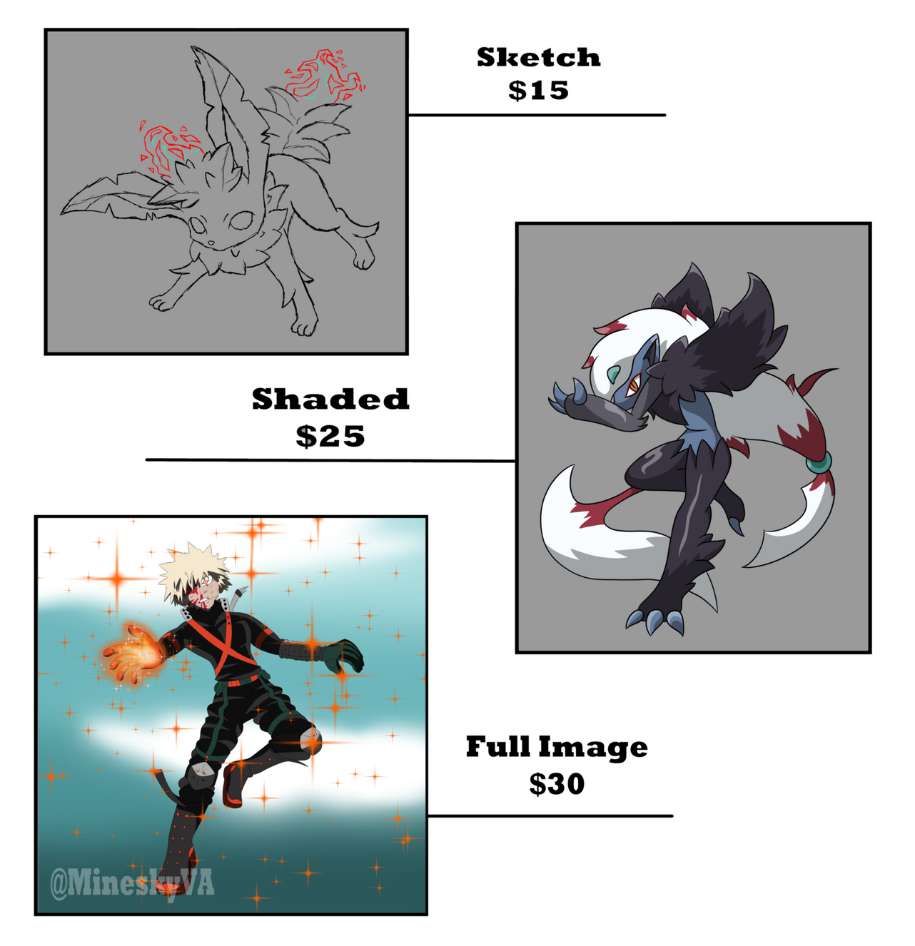 Before ordering, please read all of my terms of service. All of this art is for private commissions only. None of the art available is for commercial use. Customers are allowed to do what they wish with the art provided as long as it is for personal use only.Any prices listed are only the base prices. Prices may change depending on the complexity of character designs, backgrounds added, little/poor/no references given, and the amount of detail requested in general.If you have a problem with any of the terms listed, you may negotiate with me and try to come to an agreement.