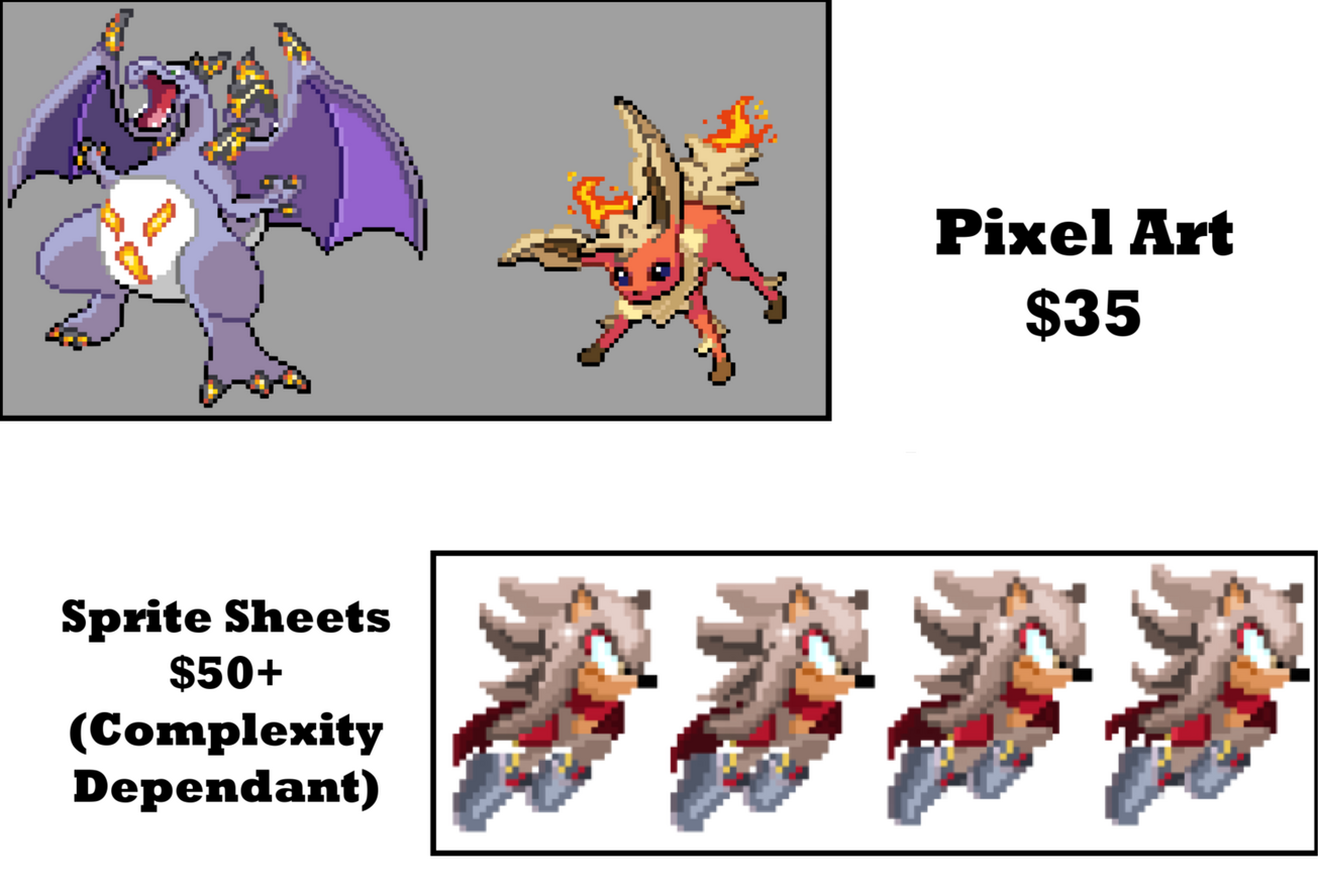 Pixel Art sheets will be based on the number of animations needed. Each animation is its own set of sprites, start to finish. Default is 5 animations at $50, increased by $5 for each additional animation